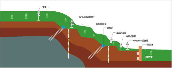 邊坡安全監測系統:主要對邊坡施工期和運營期進行實時監測,及時了解邊坡在施工期和運營期的工作狀態,對潛在災害進行提前預警,對突發事件應急報警,及時提出處理方案與措施,保證施工期和運營期的工程安全,降低邊坡事故生命財產重大損失和惡劣社會影響。同時,邊坡監測也可驗證邊坡設計和處治效果。